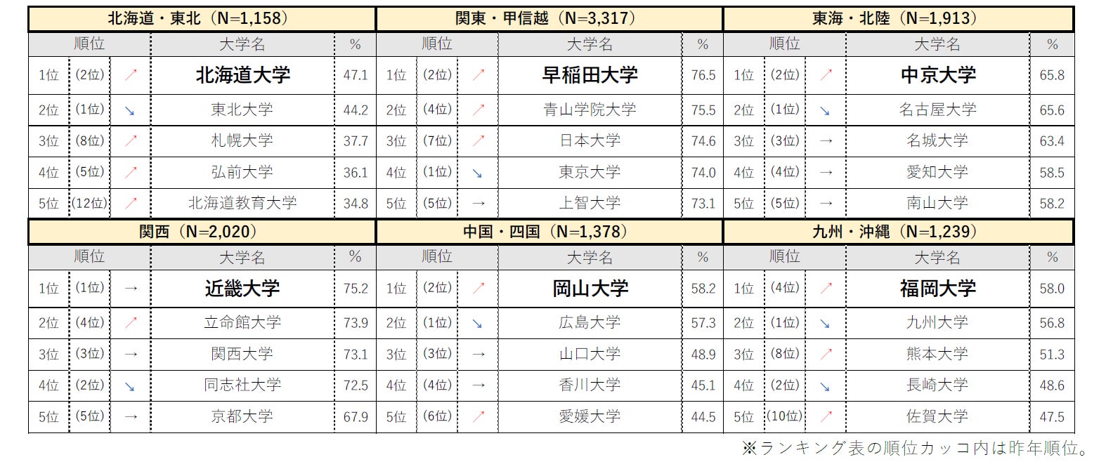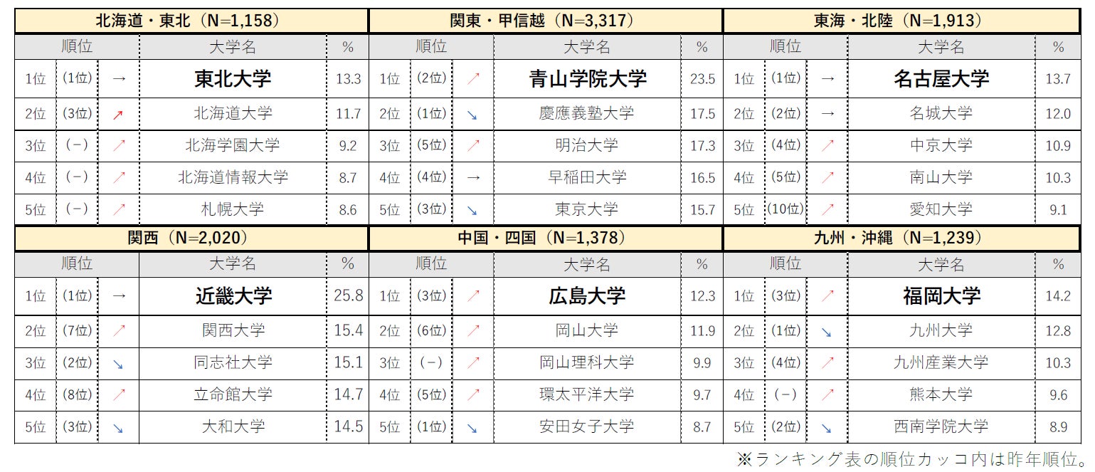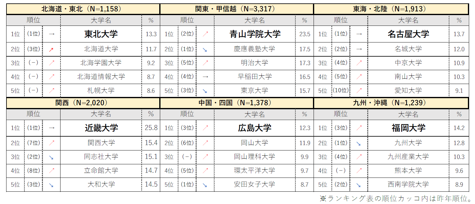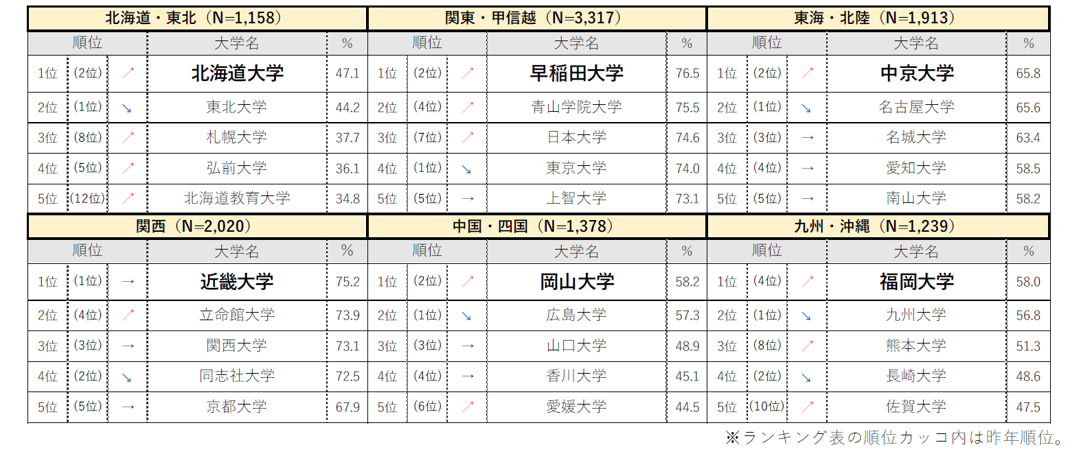 エリア別大学認知度ランキングでは、関西以外のエリアで1位が変動する結果となった。特に関東・甲信越エリアでは1位が早稲田大学、2位が青山学院大学、3位が日本大学と私立校が上位を独占し、前回1位の東京大学は4位となった。関西エリアの1位は昨年と変わらず近畿大学で、前回4位の立命館大学が2位に浮上した。前回調査では上位に国公立大学が並んだが、2023年調査では私立大学が躍進する結果となった。【図1】