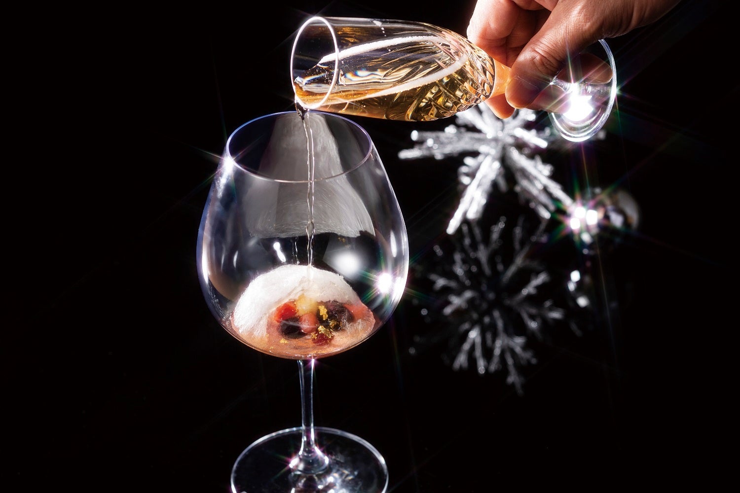バーテンダーがシャンパーニュを注ぎ、ワイングラスに入っているわたあめを溶かして完成するクリスマスカクテル。