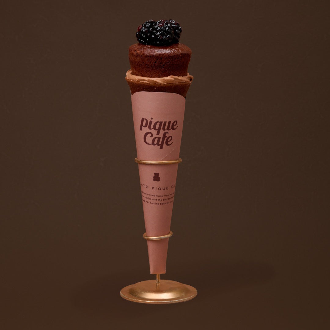 口にした瞬間に温かいチョコレートソースがトロっと溶け出すフォンダンショコラを、1つまるごと贅沢にトッピング。カカオ生地に、チョコレートと生クリームを混ぜた口どけの良いホイップクリームをのせ、香り高いバニラジェラート、ブラックベリーとカシスの甘酸っぱいソース、サクサク食感のクランキーチョコを加えました。