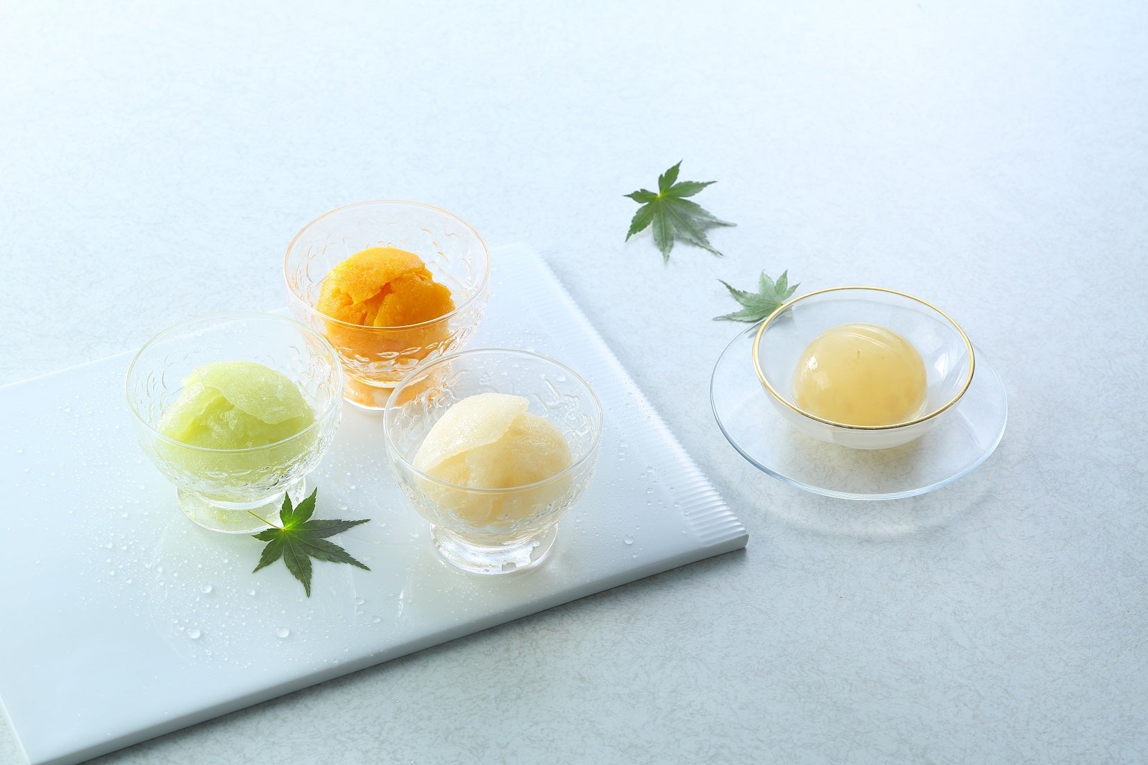 マスカット・白桃・マンゴーの果実本来の風味を生かし「凍らせてしゃーべっと、冷やしてぜりぃ」二通りの味わいをお楽しみいただけます。