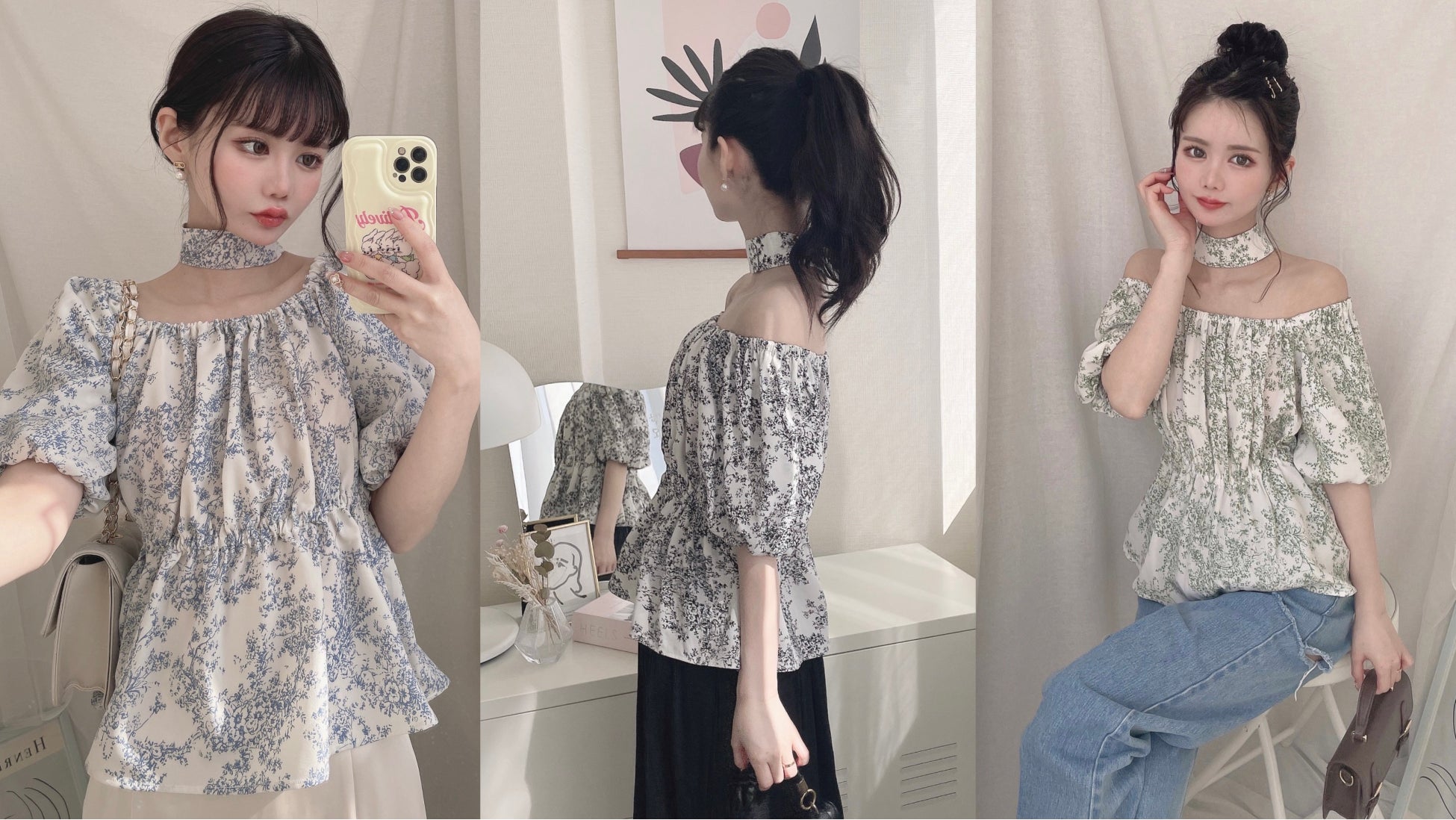 オフショルでも着られるペプラムデザインブラウス。同柄のチョーカーは調整可能なボタン付きで、気分によって取り外しができます。首元のデザインがスッキリなためデコルテラインが綺麗に見え、ヘルシーな肌見せに。スカートやデニムに合わせてピクニックに行きたくなるアイテムです。
