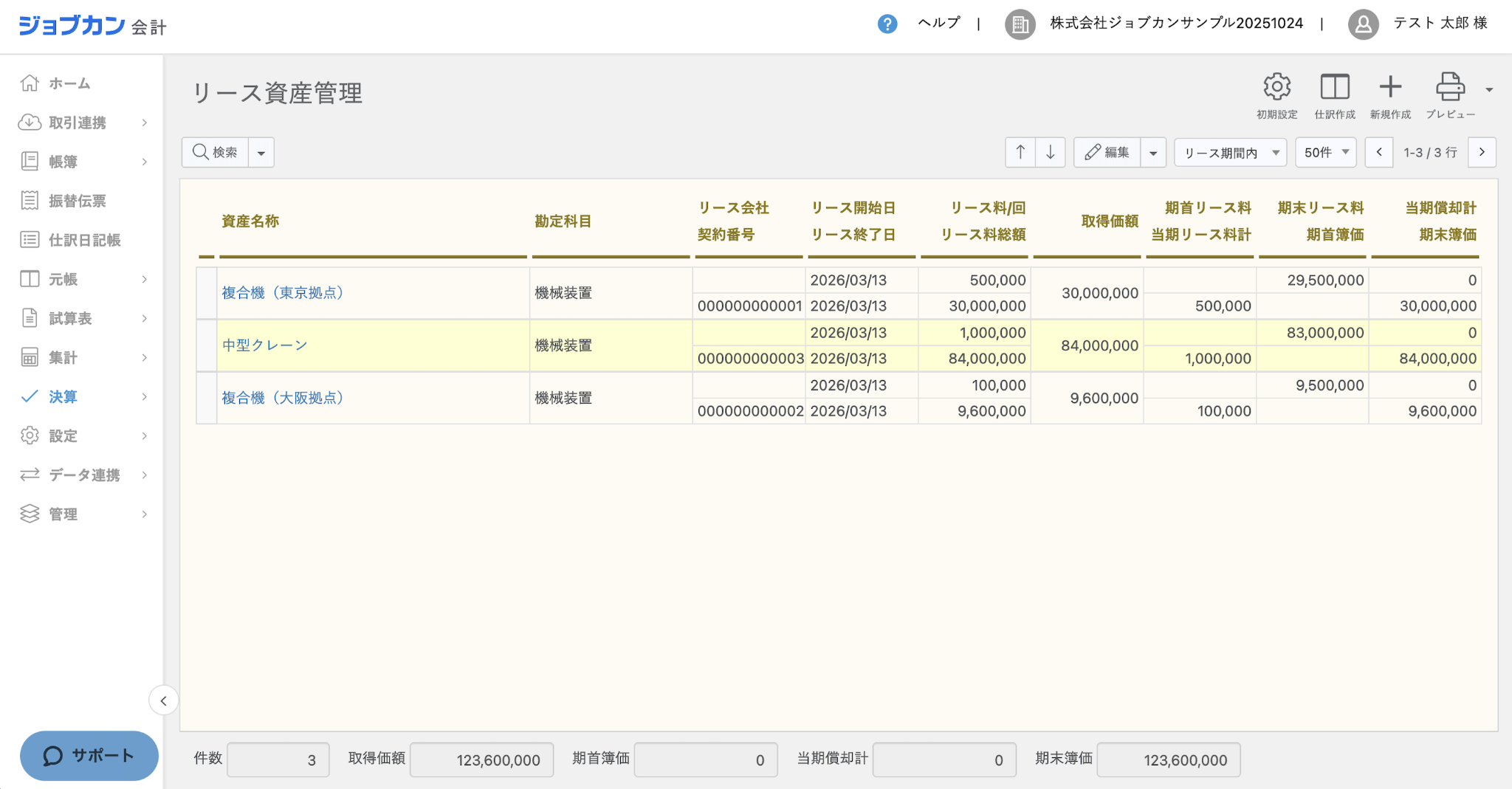 利息法に則した形で自動計算できます。また、決算報告書に必要な「未経過リース料」などの情報も自動集計が可能です。