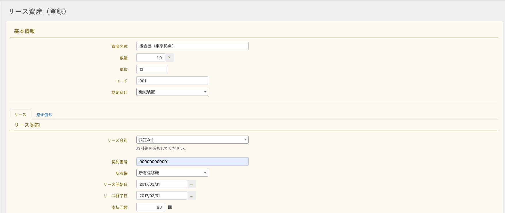 リース契約書に記載されている契約期間、資産コードなどの情報を電子保存できます。