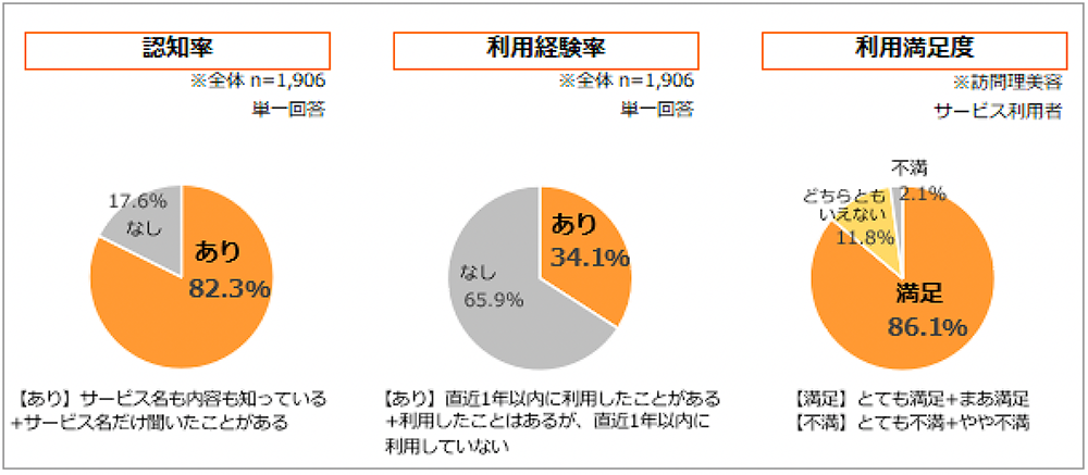 訪問理美容サービスに対する全体の認知率は82.3%であるのに対し、利用経験率は34.1%と大きな開きがある。一方、利用者は86.1%が満足している。