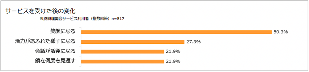 訪問理美容サービスが、介護を受けている方に何らかの良い効果を与えていると感じているご家族は84.7%と多い。サービスを受けた後の具体的な変化は「笑顔になる」が50.3%と最も多く、「活力があふれた様子になる(27.3%)」「会話が活発になる(21.9%)」「鏡を何度も見返す(21.9%)」が続く。