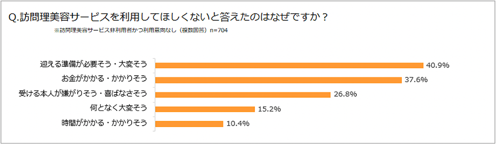 訪問理美容サービス非利用者における「今後の利用意向あり」は43.5%で、今後の利用者増加の可能性がうかがえる。一方で、「今後の利用意向なし」は56.5%。その理由は「迎える準備が必要そう・大変そう」が40.9%と、準備に関する不安が最も高い。