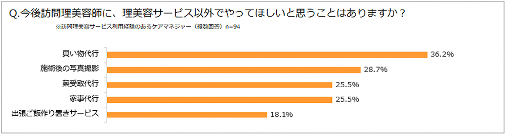 訪問理美容サービス利用経験のあるケアマネジャーのうち、「コロナが落ち着いた後、ご利用者に訪問理美容サービスを利用してほしい」と答えたのは80.9%。アフターコロナにおける訪問理美容サービスのニーズの高さもうかがえる。また、訪問理美容師に期待する理美容以外のサービスとしては、買い物代行(36.2%)、施術後の写真撮影(28.7%)などが挙げられている。高齢者と離れて暮らすご家族がいる中、今後さまざまなサービスが生まれてくるのではと考えられる。