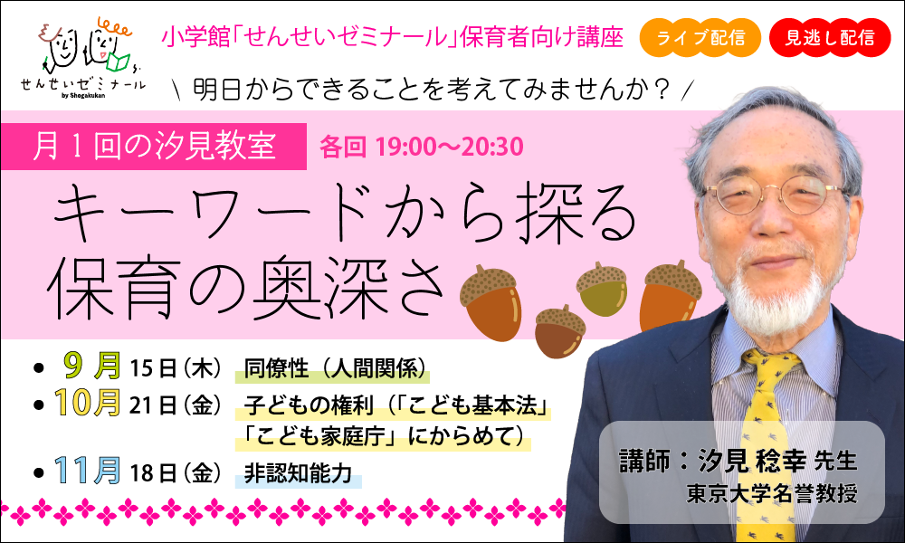 小学館【せんせいゼミナール】月1回の汐見教室「キーワードから探る保育の奥深さ」(9・10・11月)オンライン講座 申込受付中!
