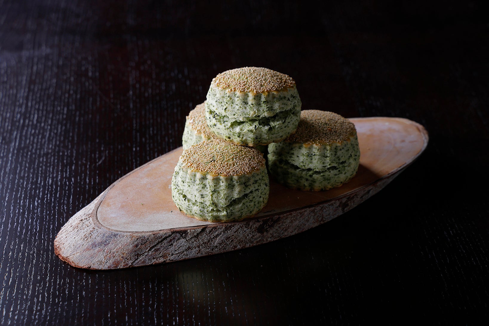 アフタヌーンティーで提供する「碾茶とけしの実のスコーン」は、19F M-Boutiqueにてテイクアウト用としても販売します。碾茶の豊かな風味と表面のけしの実の食感が特徴です。ホテルメイドのスコーンをお楽しみください。