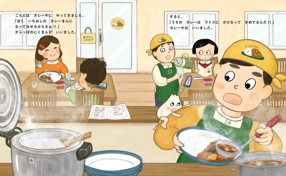 中身を詰めてもらえず、からっぽのままになってしまったにくまん。中身を求めてピザ屋さん、和菓子屋さん、カレー屋さん…あちこちめぐります。空腹でへろへろになったにくまんが駆け込んだ先は…?