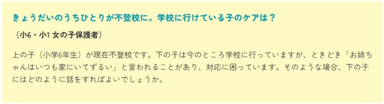 学校に通えているほうのお子さんが口にしがちな「ずるい」という言葉の奥にある本当の気持ちや、それぞれの子に対して親がどのように向き合うのが良いのかなど、具体的な声掛け例も交えながらお答えしています。