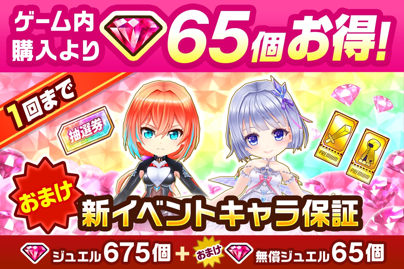 内容物:「ジュエル」675個、「無償ジュエル」65個、「新イベントキャラ保証」など
