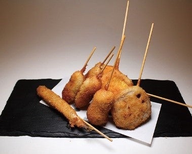 G20大阪サミットにも出店した串カツの名店。クロワッサン生地と特製パン粉を衣にした創作串カツ。