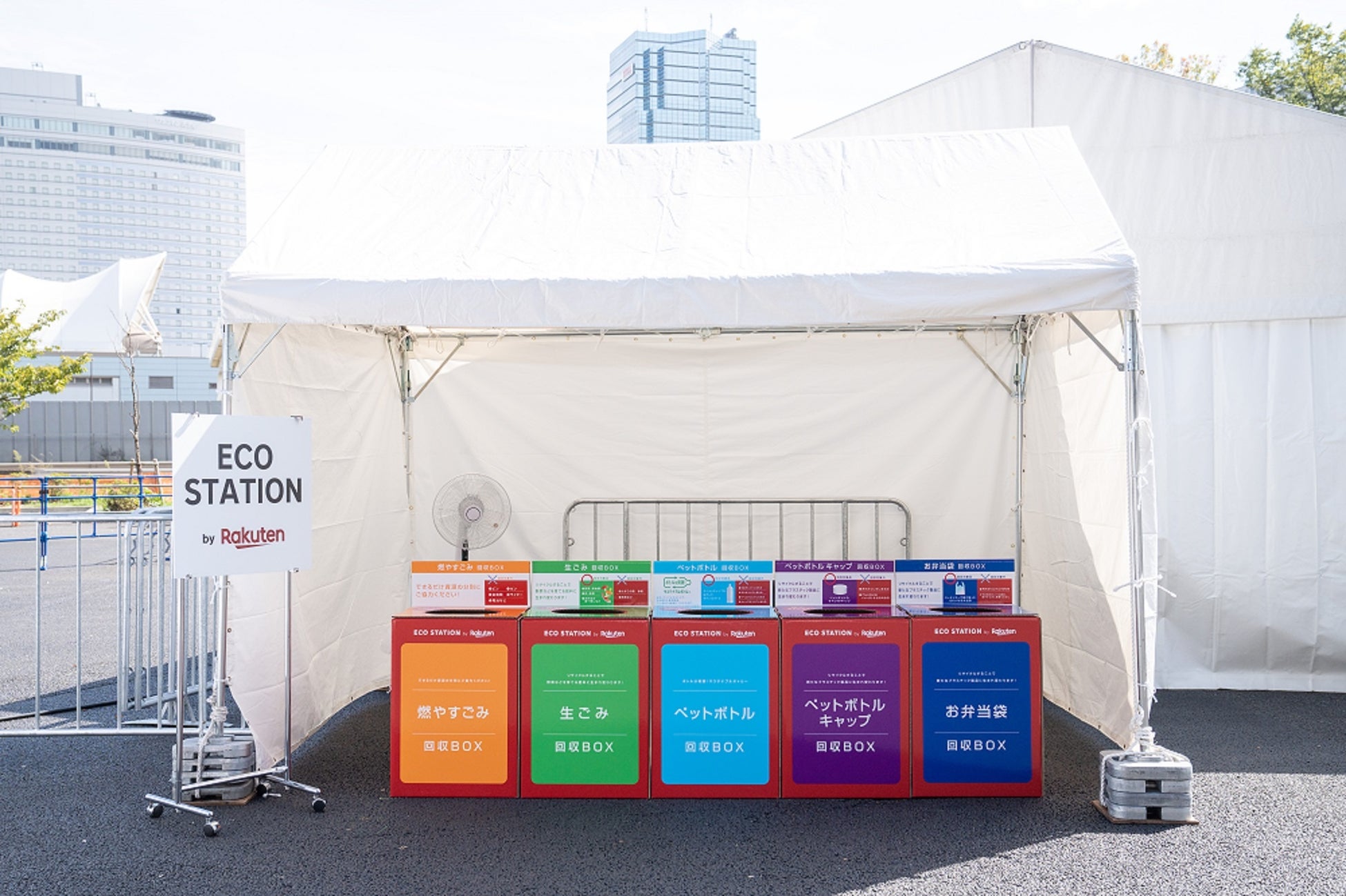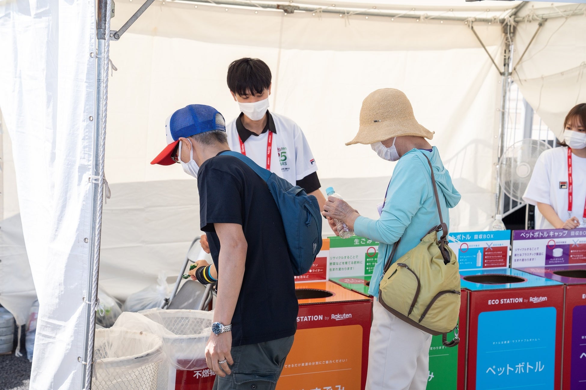 「楽天オープン2022」では、ごみ分別BOX「ECO STATION by Rakuten」を会場内に設置し、本イベントから発生する廃棄物を5種類(①可燃②ペットボトル③ペットボトルキャップ④生ごみ⑤お弁当袋)に分別。可能な限り品目ごとのリサイクルループを構築して再資源化し、焼却処理量を削減することで、CO2排出量を減らす取り組みを行いました。ペットボトルは、再びペットボトルへ生まれ変わり、ペットボトルキャップは再生樹脂としてリサイクルされ、テニス関連用品へ生まれ変わります。お弁当袋も再生樹脂となり、別のプラスチック資材の原料となります。また、生ごみはメタン発酵施設へ運ばれ、電気と有機肥料にリサイクルされました。