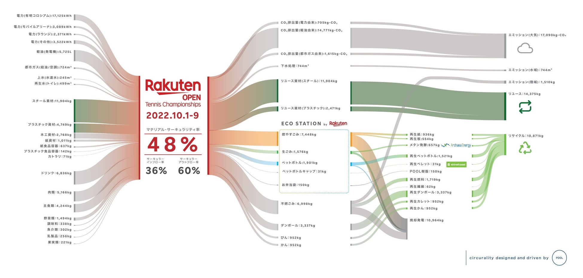 「楽天オープン2022」では、リユース資材の使用と再リユース、会場内に設置したごみ分別BOX「ECO STATION by Rakuten」による廃棄物の分別・リサイクルなどの徹底により、サステナブルな大会運営に向けた取り組みが実施されました。その結果、排出された資源の循環性を示す「サーキュラーアウトフロー率」は60%となりました。大会運営のために投入された資源の循環性を示す「サーキュラーインフロー率」は36%で、これらの各要素を考慮した「マテリアル・サーキュラリティ率」は48%となりました。
