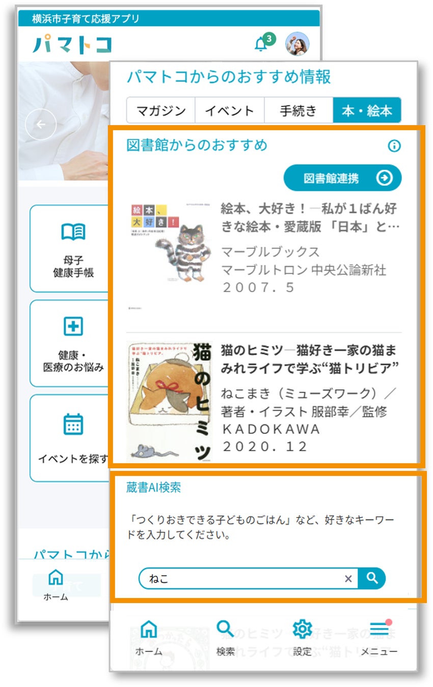これまで掲載していた情報に加えて、パマトコに登録されたお子さまの年齢に応じたおすすめの本・絵本が表示されます!お気に入りの本が見つかったら、そこから貸出予約も可能です。