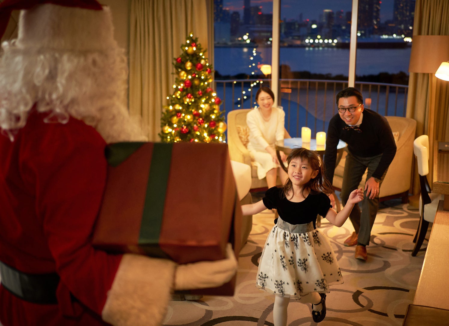 お預かりしたプレゼントを、サンタクロースがご宿泊当日にお部屋へお届け。ディナープレートやクリスマスケーキをルームサービスでご用意します。クリスマスツリーがきらめく空間で、思い出に残る家族でのクリスマスをお過ごしください。