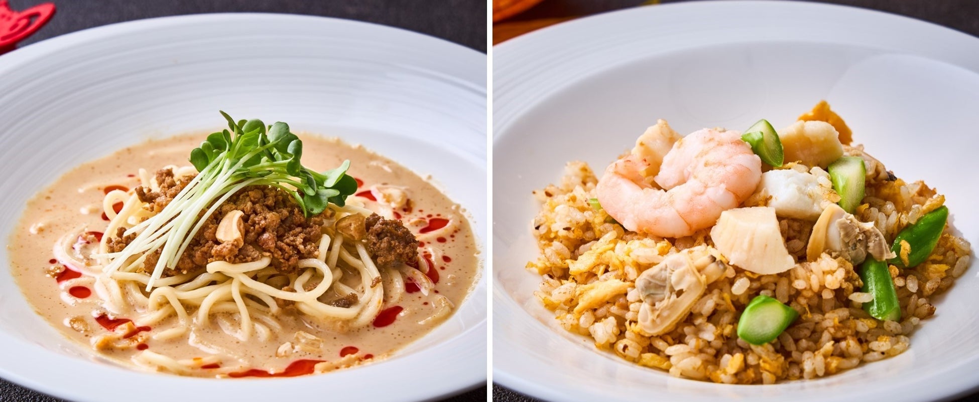 食事は2種類からお好みのものをお選びいただけます。「桂林」オリジナルの「冷やし豆乳担々麺」は、まろやかで優しい味わいの中にもピリッとした辛さがある、夏にピッタリな一品です。台湾で幅広い世代に愛される、海産物の旨みが凝縮された調味料“沙茶醤”を使い、海老、いか、あさり、帆立貝などの海鮮を盛り付けたコクのある炒飯もおすすめです。