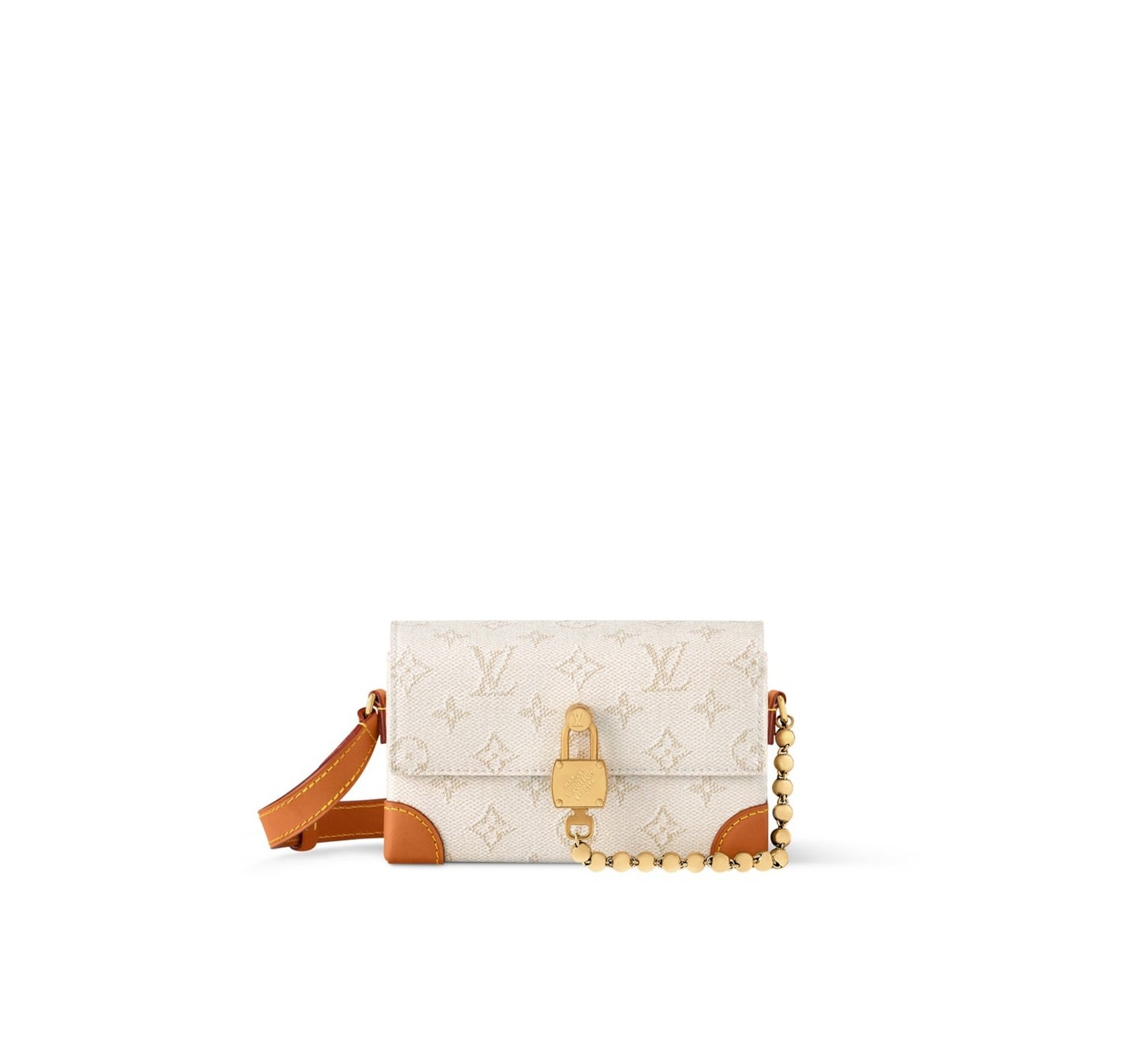 新たな装飾的ボールチェーンと「Marque L. Vuitton Déposée」の刻印入りスクエア形パドロック(錠前)をあしらった「スティーマー·ウェアラブル ウォレット」。レザーで補強されたコーナー部分にはパドロック(錠前)と同色のリベットをあしらいました。ストライプのライニングを配した内装にはファスナー式ポケットをプラス。調節可能なストラップで肩掛けと斜め掛けの両方を楽しめます。