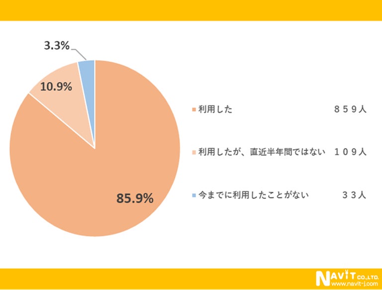 半年間でクーポンを利用したかについてのアンケートでは、「利用している」と答えた人が1番多く85.9%でした。「利用したが、直近半年間ではない」と答えた人は10.9%、「今までに利用したことがない」と答えた人が3.3%でした。