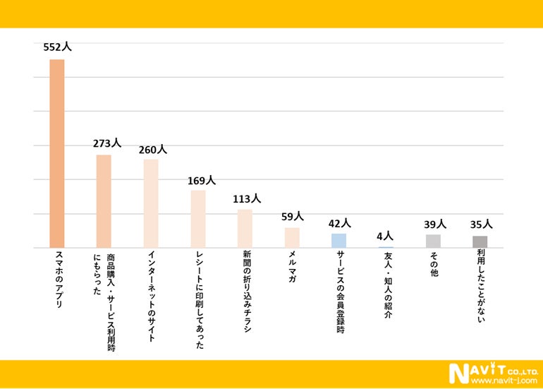 クーポンの入手方法についてのアンケートを複数回答可で行いました。「スマホのアプリ」が1番多い552人で、次点に約2倍の差を付けました。その次点は「商品購入・サービス利用時にもらった」で273人、さらにその次が「インターネットのサイト」で260人と続いています。