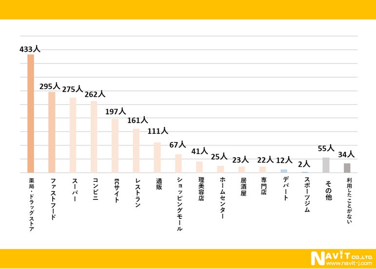 クーポンを利用した場所についてのアンケートを複数回答可で行いました。「薬局・ドラッグストア」が1番多く433人でした。次に多かったのが「ファーストフード」で295人、その次が「スーパー」で275人と続く結果となりました。