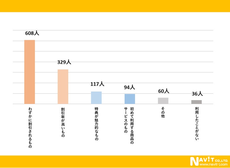 利用したクーポンの特徴についてのアンケートを複数回答可で行いました。「わずかに割引されるもの」が1番多い608人と、アンケート全体の半数近くを占めました。次に多かったのが「割引率が高いもの」で329人、その次が「特典が魅力的なもの」で117人と続く結果となりました。