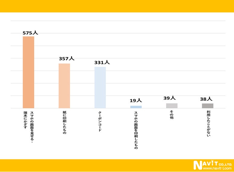利用したクーポンのタイプについてのアンケートを複数回答可で行いました。「スマホの画面を見せる・端末にかざす」タイプが1番多く575人でした。次に多かったのが「紙に印刷したもの」で357人、その次が「クーポンコード」で331人と続く結果となりました。クーポンもデジタル式のものが主流になってきているようです。