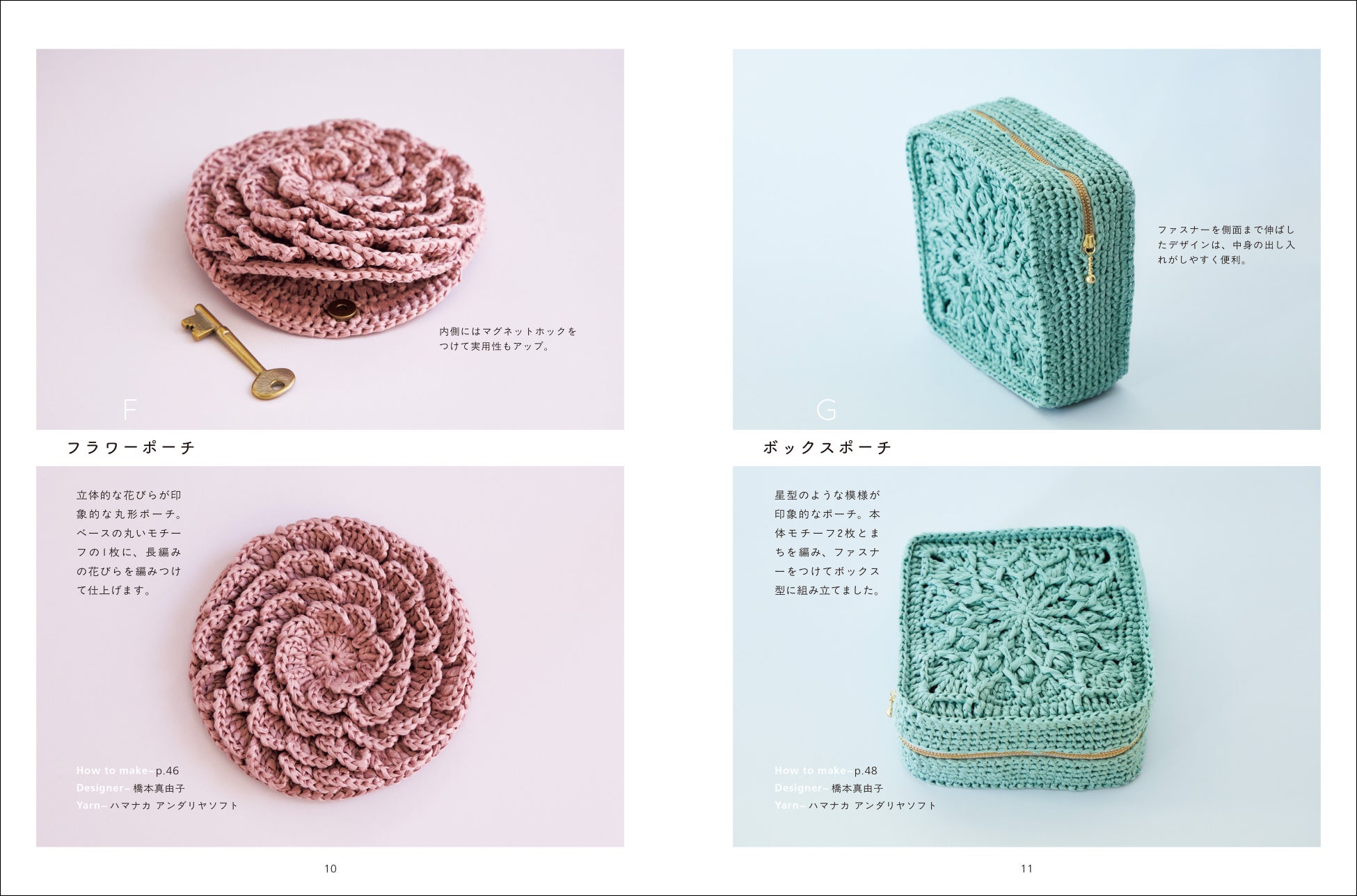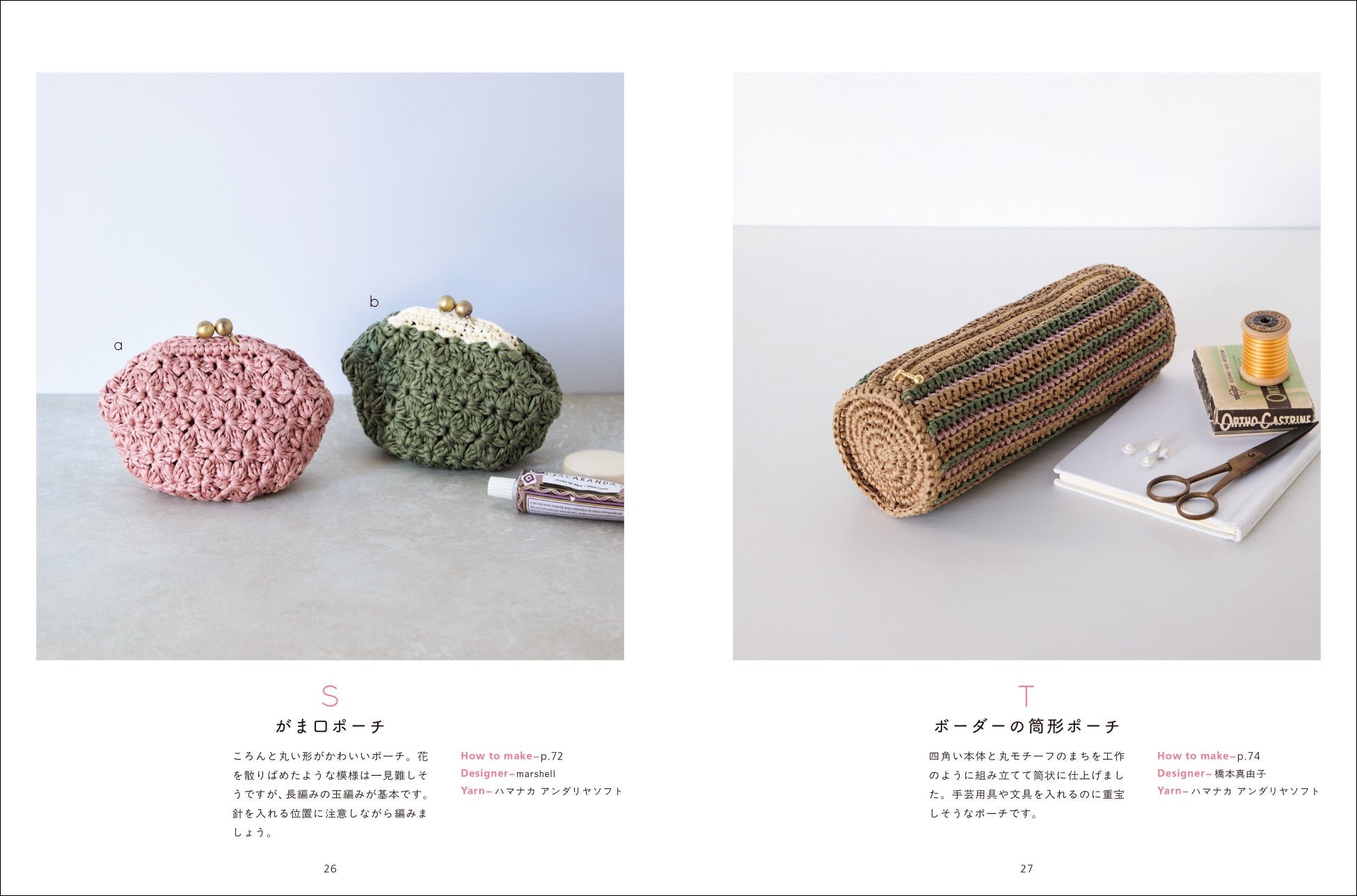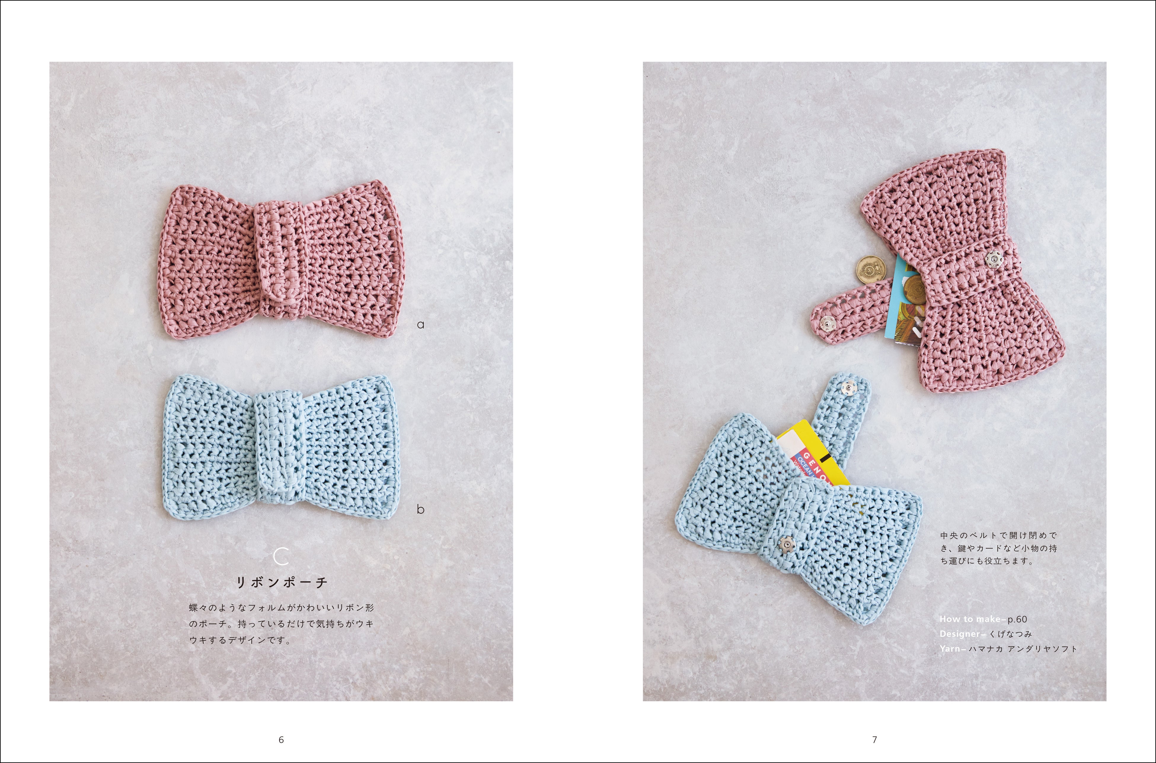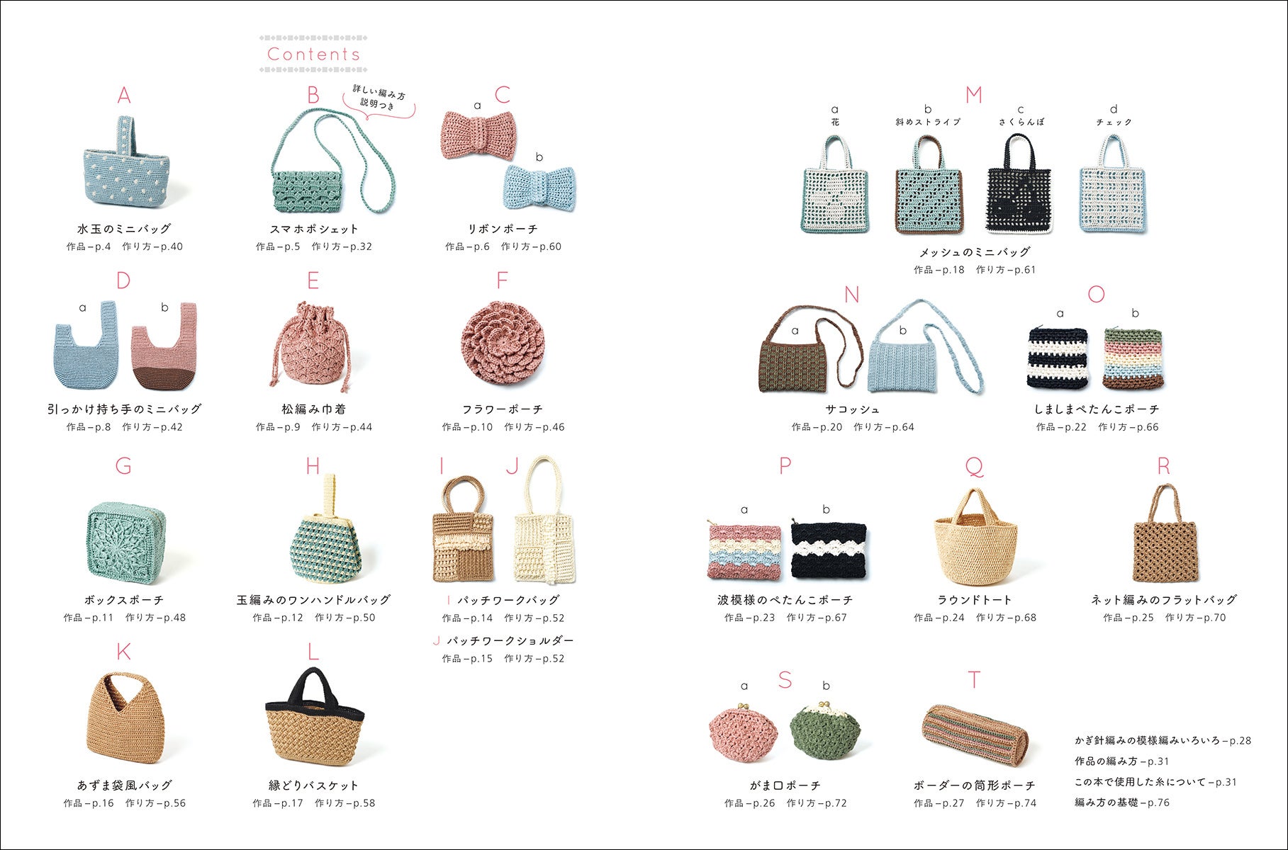 小物の整理に役立つ巾着、ポーチなど、いくつも編みたくなる作品ばかりです。
