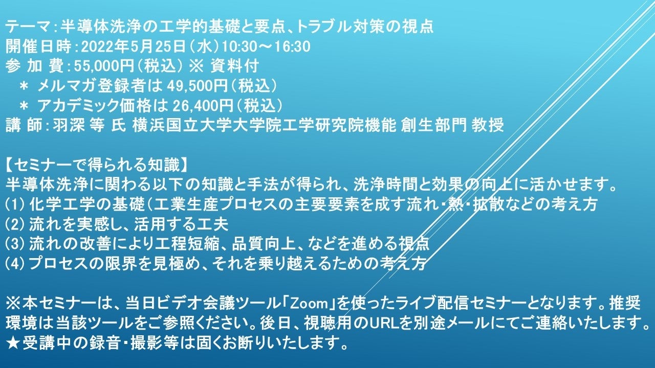 先端技術情報や市場情報を提供している(株)シーエムシー・リサーチ(千代田区神田錦町: https://cmcre.com/ )では、 各種材料・化学品などの市場動向・技術動向のセミナーや書籍発行を行っておりますが、 このたび「半導体洗浄の工学的基礎と要点、トラブル対策の視点」と題するセミナーを、 講師に羽深 等 氏 横浜国立大学大学院工学研究院機能 創生部門 教授)をお迎えし、2022年5月25日(水)10:30より、 ZOOMを利用したライブ配信で開催いたします。 受講料は、 一般:55,000円(税込)、 弊社メルマガ会員:49,500円(税込)、 アカデミック価格は26,400円(税込)となっております(資料付)。