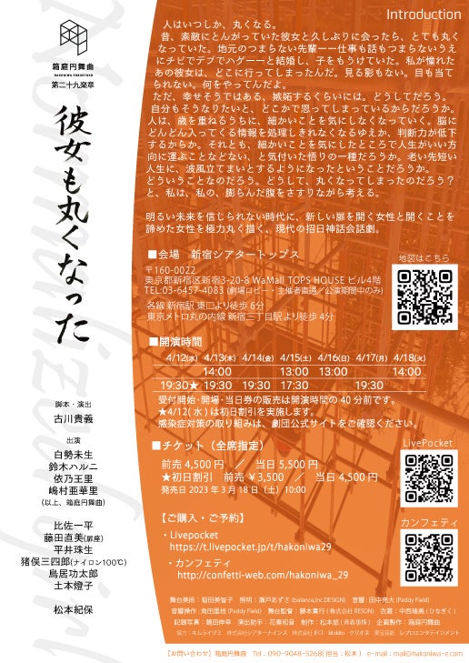 箱庭円舞曲 第二十九楽章『彼女も丸くなった』が2023年4月12日(水)~18日(火)に新宿シアタートップス(東京都新宿区新宿3丁目20-8 TOPS HOUSE 4F)にて上演されます。チケットはカンフェティ(運営:ロングランプランニング株式会社、東京都新宿区、代表取締役:榑松 大剛)にて3月18日(土)10:00より発売開始です。