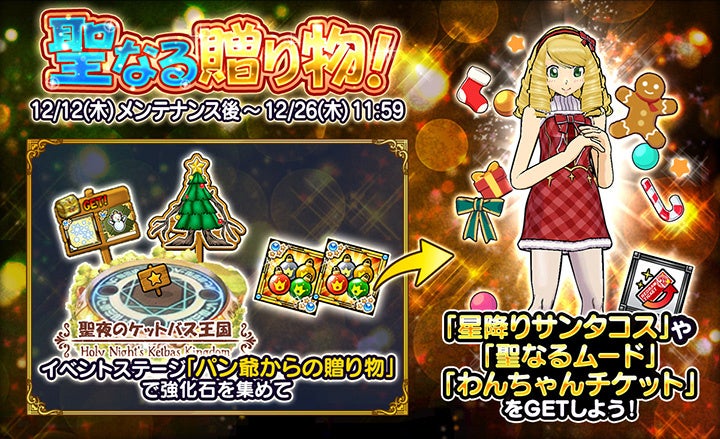 さまざまなクリスマスステージが大集結したイベントステージ「聖夜のケットバス王国」が登場します。1日1回挑戦可能なイベントステージ「パン爺からの贈り物」で手に入る強化石「聖なるオーナメント」を必要個数集めると、達成報酬としてドレス「星降りサンタコス」やおしゃれグッズ「聖なるムード」、スロットを引き直すことができる「わんちゃんチケット」などがゲットできます。