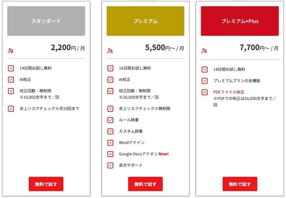 法人向けプランは30日間の無料トライアルが可能で、通常料金から15%OFFのお得な年払いにも対応しています。個人向けプラン、API連携プランは14日間の無料トライアルを実施しています。今後も文章校正や情報発信にかかわる業務効率改善、誤植や不適切表現に起因するブランド毀損や炎上などのリスクマネジメントに貢献するため、さらなる機能・サービスの向上に取り組んでまいります。