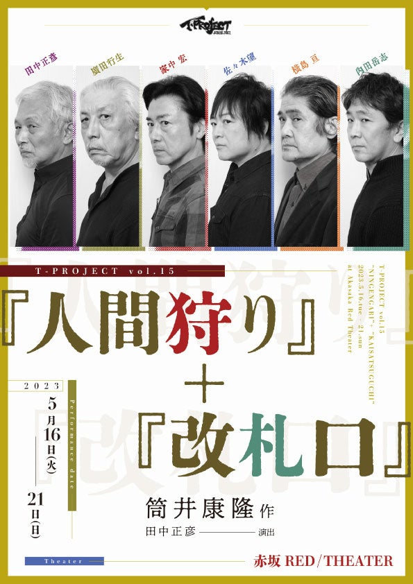 田中正彦企画・制作、T-PROJECT『人間狩り』+『改札口』が2023年5月16日(火)~21日(日)に赤坂RED/THEATER(東京都港区赤坂3-10-9赤坂グランベルホテルB2F)にて上演されます。チケットはカンフェティ(運営:ロングランプランニング株式会社、東京都新宿区、代表取締役:榑松 大剛)にて4月10日(月)より発売開始です。