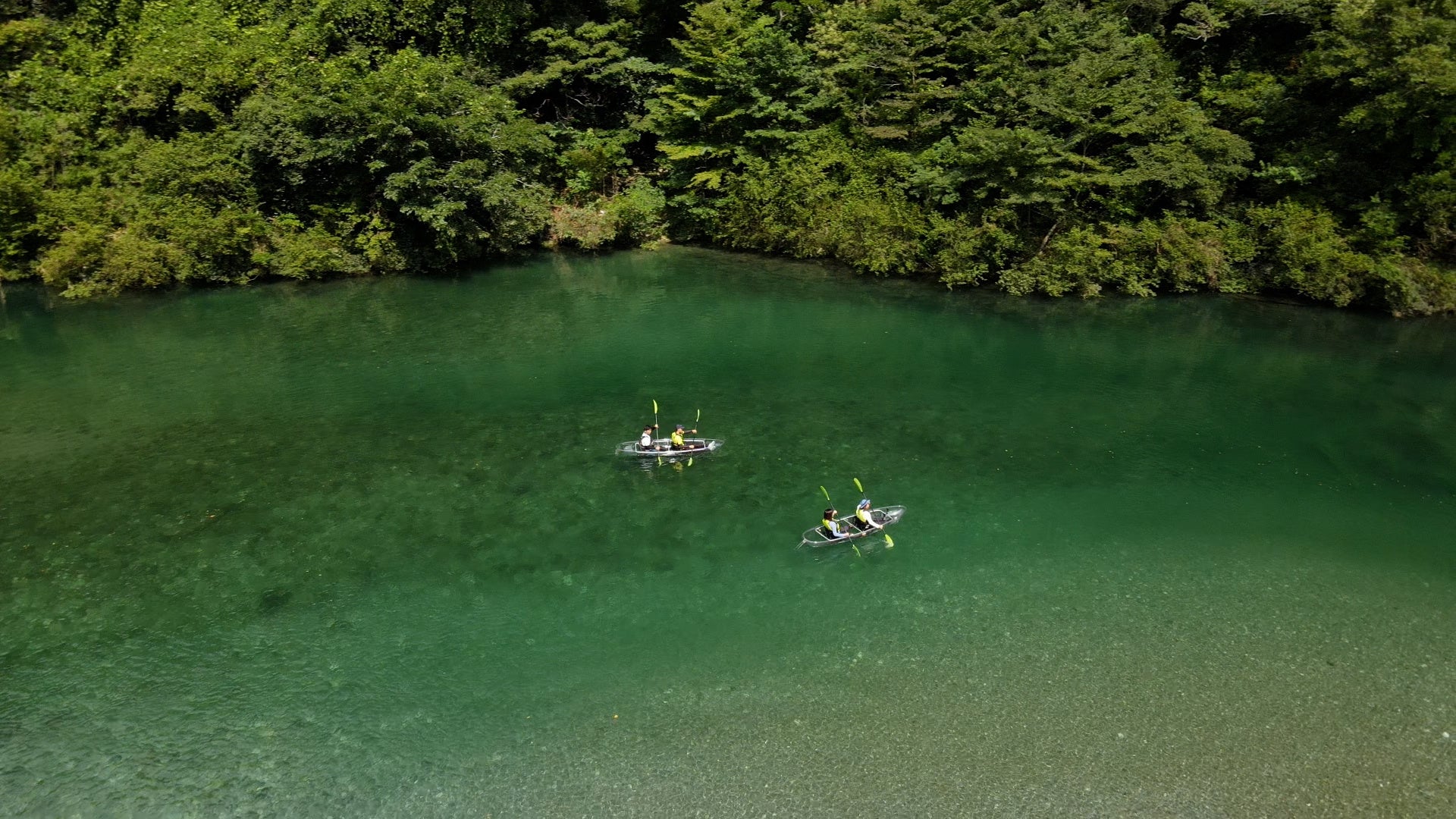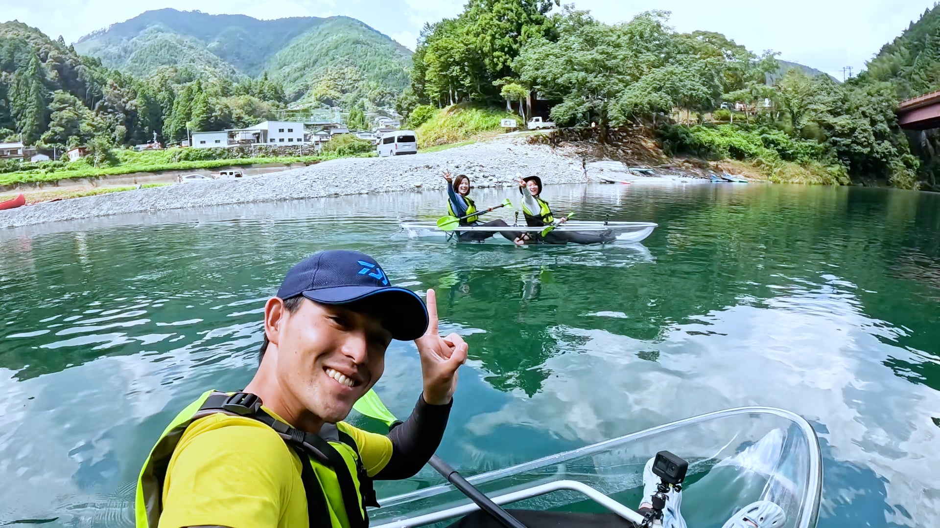そこで見つけたのは、船自体が透明のクリスタルカヤック!青緑色に輝く奇跡の清流の上を飛んでいるかのような体験に、3人のテンションMAX!