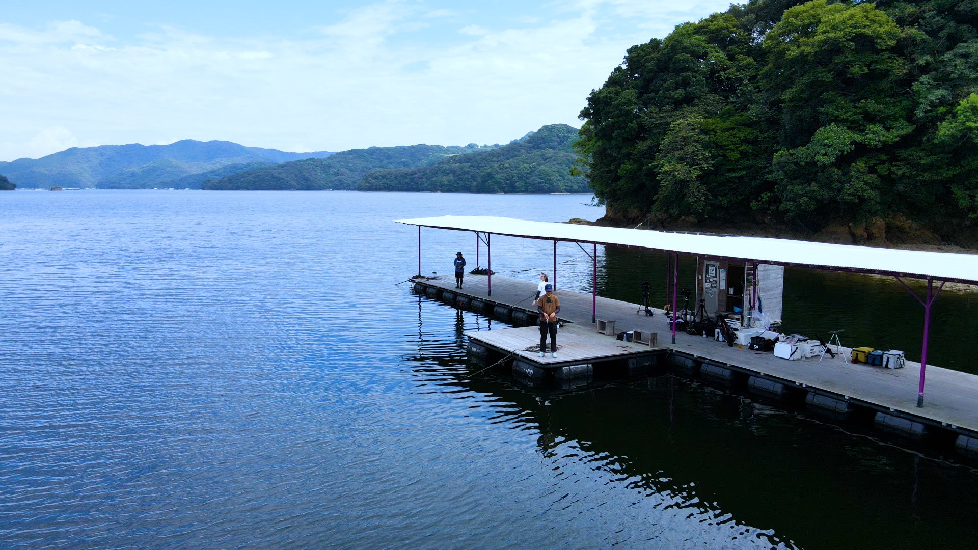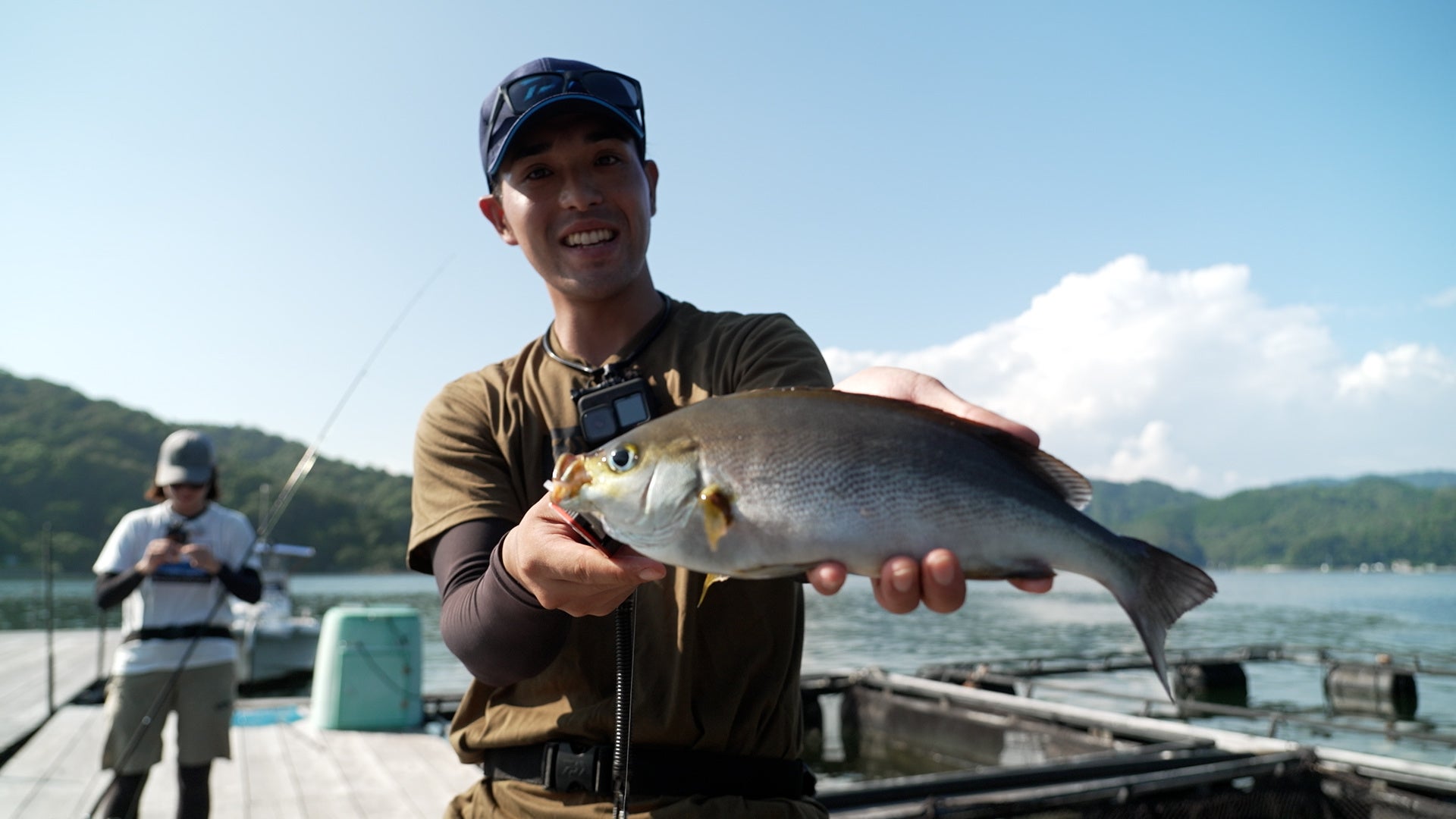 見えてきたのは湾内に浮かぶ大きなイカダ!実はいま全国的に家族や仲間で貸切ることができるイカダ釣りが密かなブームに。ここは電源やトイレも完備されており、自分たちだけのプライベート空間で釣りを楽しむことができる。