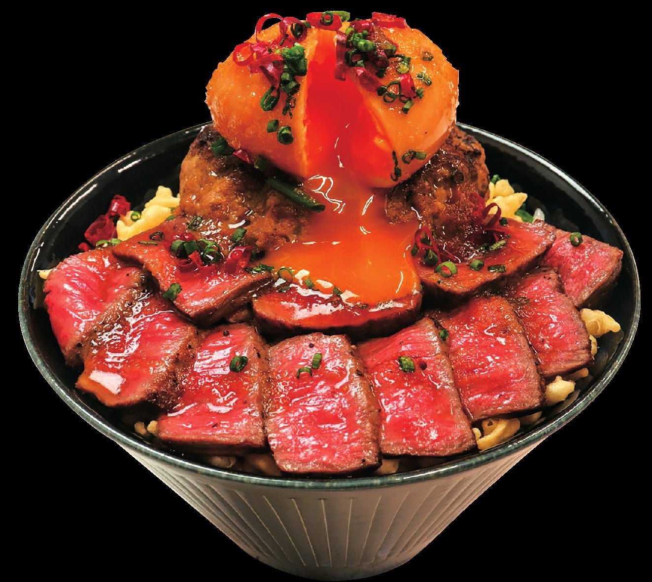 極上赤身ステーキの上に、和牛と黒豚の黄金比率で作ったハンバーグを乗せ、さらにとろ~り煮卵をトッピングしました。