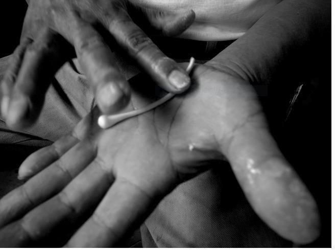 先と呼ばれる先の尖った刃物を用い、切り抜き籠目文様を表現します。