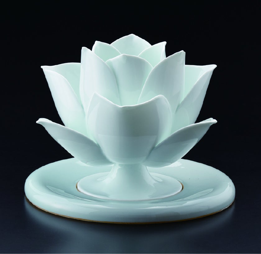 複数の轆轤成型から生まれる重なり合う曲線が魅力の蓮作品は一四代平戸悦山の優美な逸品です。