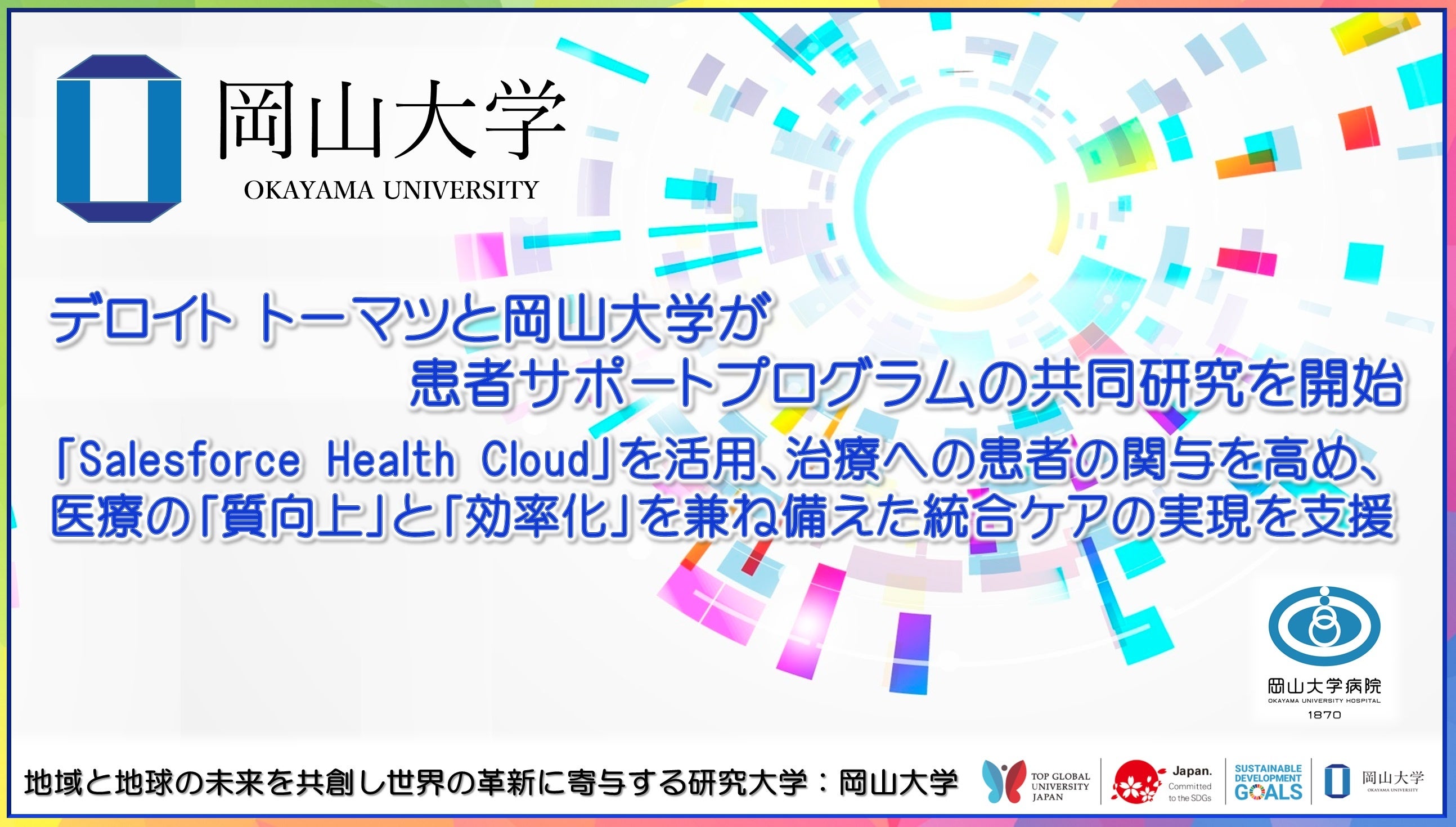 デロイト トーマツ グループのデロイト トーマツ コンサルティング合同会社(東京都千代田区、代表執行役社長 佐瀬真人、以下 デロイト トーマツ)と国立大学法人岡山大学(岡山県岡山市、学長 那須保友、以下 岡山大学)は、株式会社セールスフォース・ジャパンのクラウド型の患者管理ソフトウェア「Salesforce Health Cloud」を活用し、治療への患者の積極的な関与を高めるサポートプログラムの共同研究を始めました。