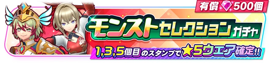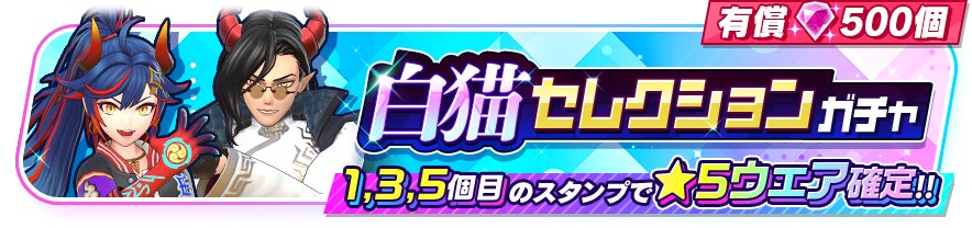 『モンスターストライク』からはカエサル(CV:高山みなみ)、マサムネ(CV:悠木碧)の2キャラクターのみ、『白猫』からはエンマ(CV:長谷川育美)、ヴィルフリート(CV:子安武人)の2キャラクターのみの★5ウェアが登場するガチャを開催予定です。本ガチャは有償ジュエル500個限定で5回までまわすことができ、1回目、3回目、5回目のスタンプでは★5ウェアが確定となります。それぞれのキャラクターは限定ウェアも登場します。