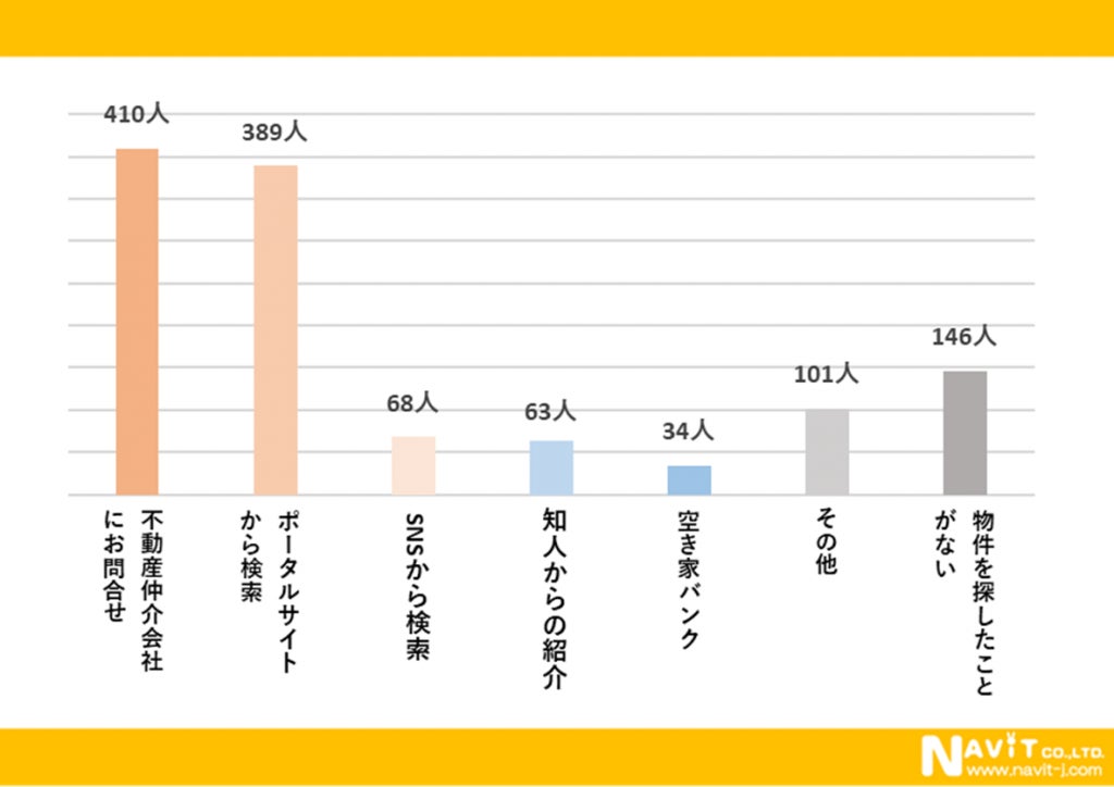 こちらは複数回答でのアンケートです。物件探しの手段についてのアンケートでは、「不動産仲介会社にお問合せ」が最多で430人、次が「ポータルサイトから検索」が389人、その次が「SNSから検索」で68人と続く結果となりました。