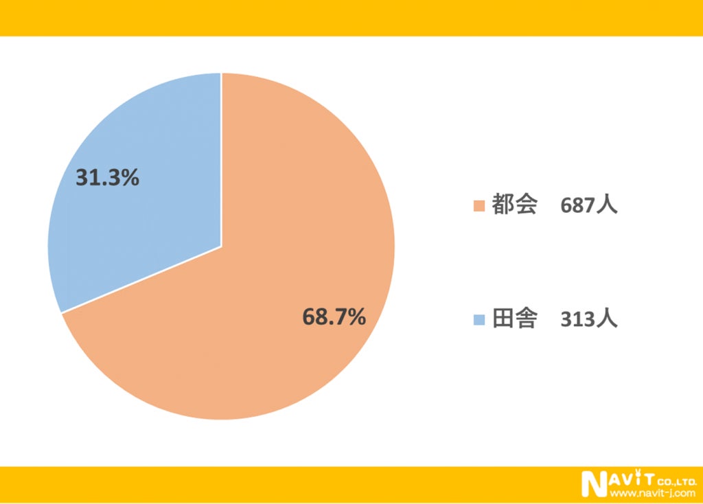 都会と田舎のどちらに住みたいかについてのアンケートでは、「都会」が68.6%、「田舎」が31.4%という結果になりました。都会志向が伺えますね