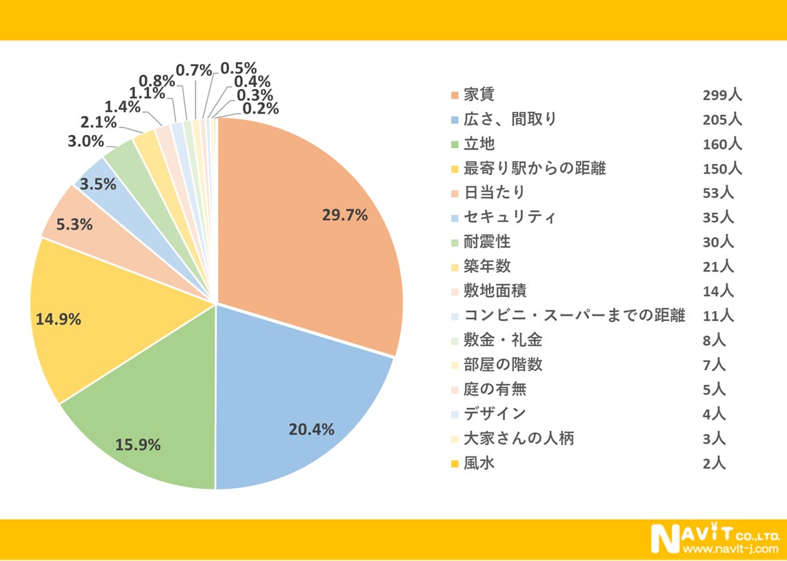 物件選びで最も重要視する条件についてのアンケートでは、「家賃」が最多で29.7%、次が「広さ、間取り」で20.4%、その次が「立地」で15.0%と続く結果となりました。住み心地に関する条件よりも、コスト条件を優先する人のほうが多いようです。