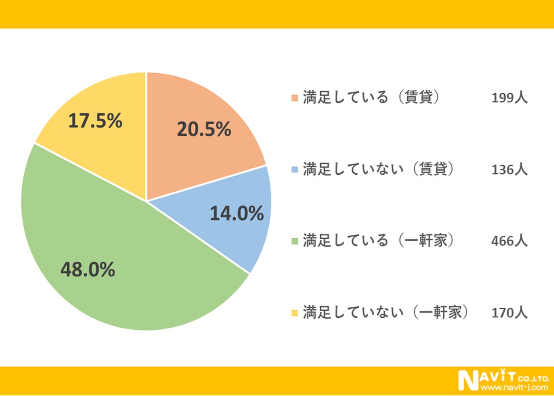 住んでいる物件への満足度についてのアンケートでは、「満足している(一軒家)」が最多で、約半数の48.0%を占めました。2番目に「満足している(賃貸)」で20.5%、3番目に「満足していない(一軒家)」で17.5%と続きます。一軒家と賃貸を合計すると、満足している人は60%以上を占めています。
