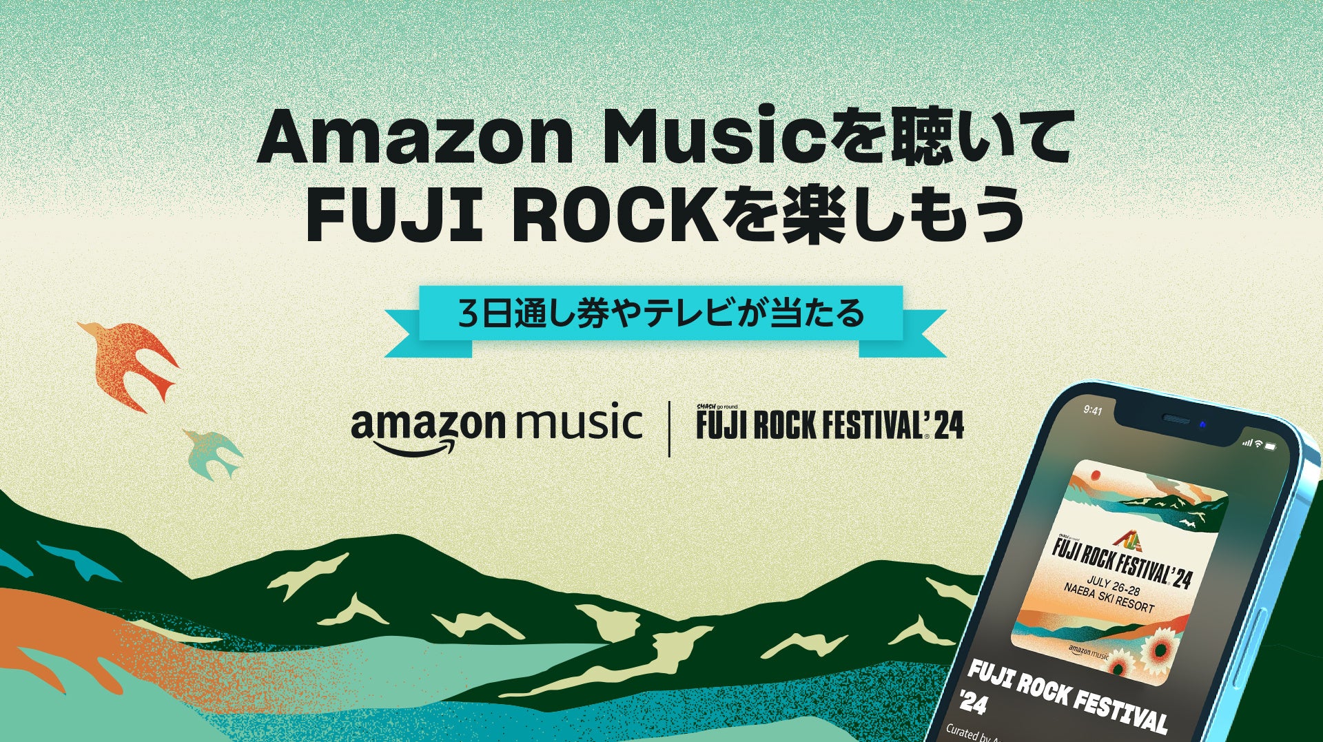 同フェスの予習復習ができるプレイリストの配信や、「FUJI ROCK FESTIVAL ’24」の3日通し券やスマートテレビが抽選で当たるほか、Amazonギフトカードが当たる2つのキャンペーンも実施