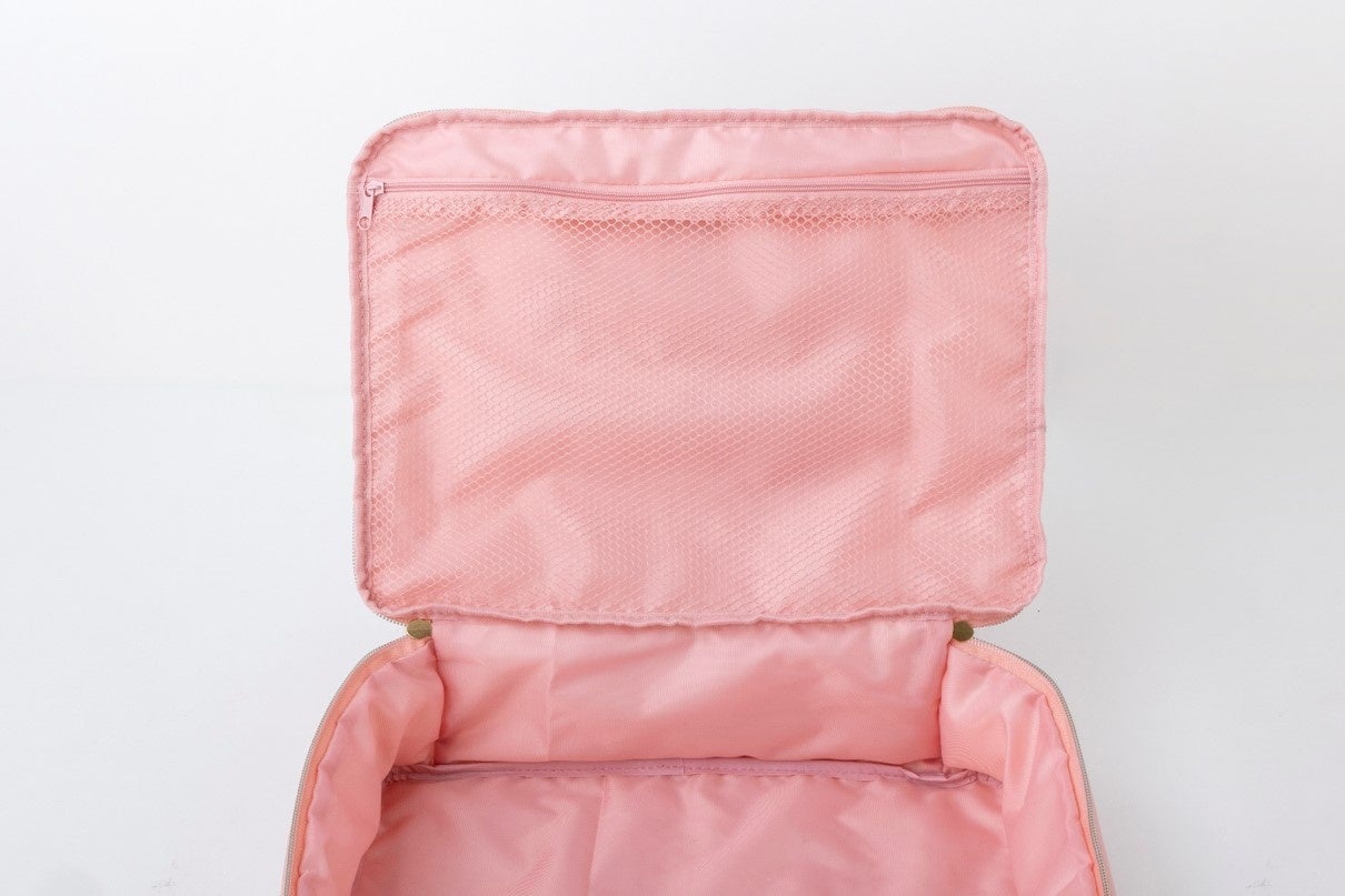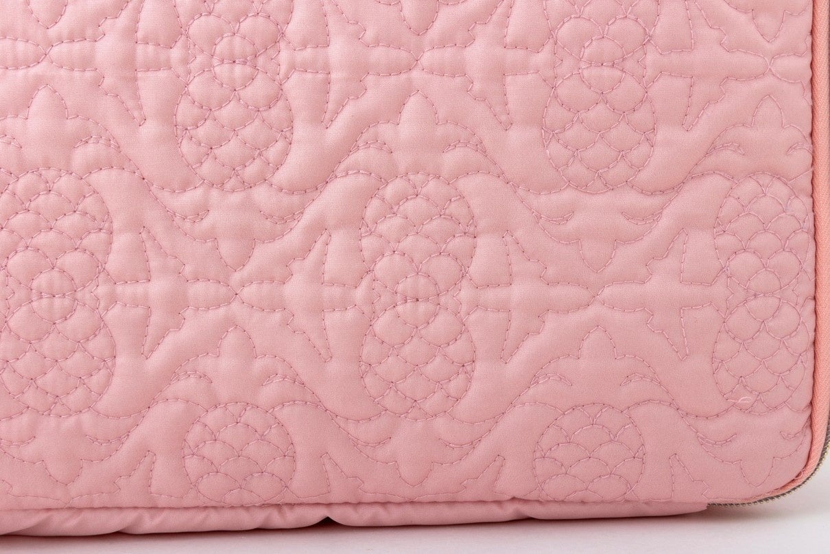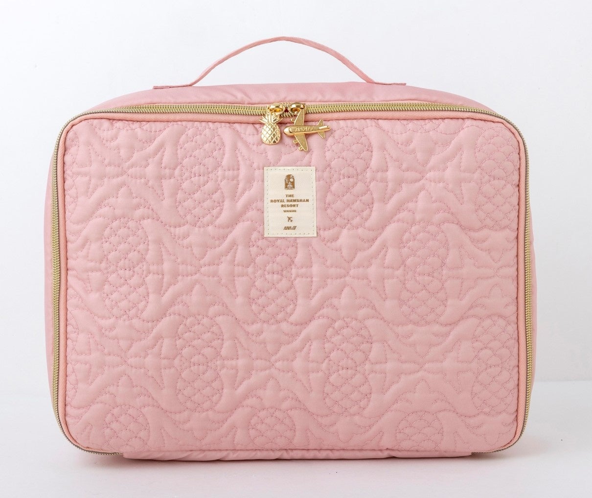 本誌限定のスペシャルアイテムは、旅に便利な大容量ポーチ。ロイヤルハワイアンをイメージしたピンク色で、パイナップルと飛行機柄のキルティング生地がポイントです。ファスナートップはパイナップル&ANAロゴ入り飛行機になっています。Tシャツや帽子も入る大容量で、内側には便利なメッシュポケットもつき、旅行時にはもちろん日常使いでも活躍します。
