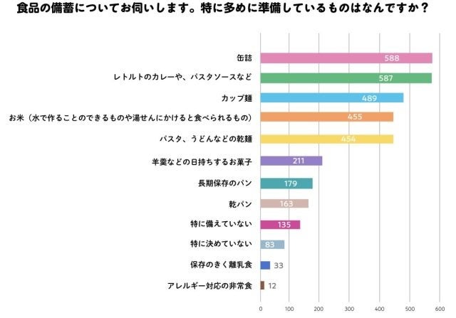 1位 缶詰(588名)、2位 レトルトのカレーや、パスタソースなど(587名)、3位 カップ麺(489名)、4位 お米(レトルト含む)(455名)5位 パスタ、うどんなどの乾麺 (454名)などが上位でした。また、アレルギーをお持ちのお子さんがいる家庭では、アレルギー対策の防災備蓄も必要なようです。