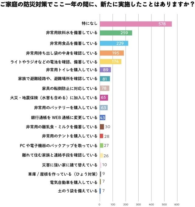 1位は特になしと答えた方が578名。これは基本的な防災への備えは常にしてあるということなのかもしれません。