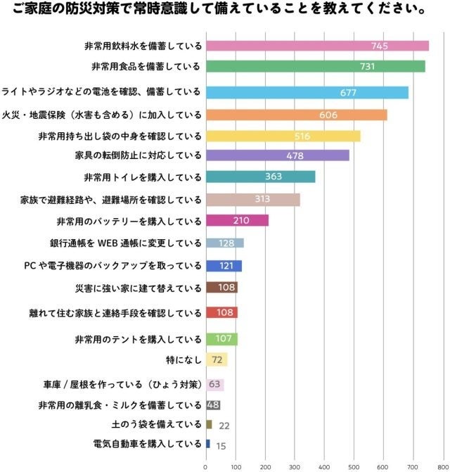 子育て世代の各家庭では常に意識している防災対策として具体的にどんな備えをしているのでしょうか。